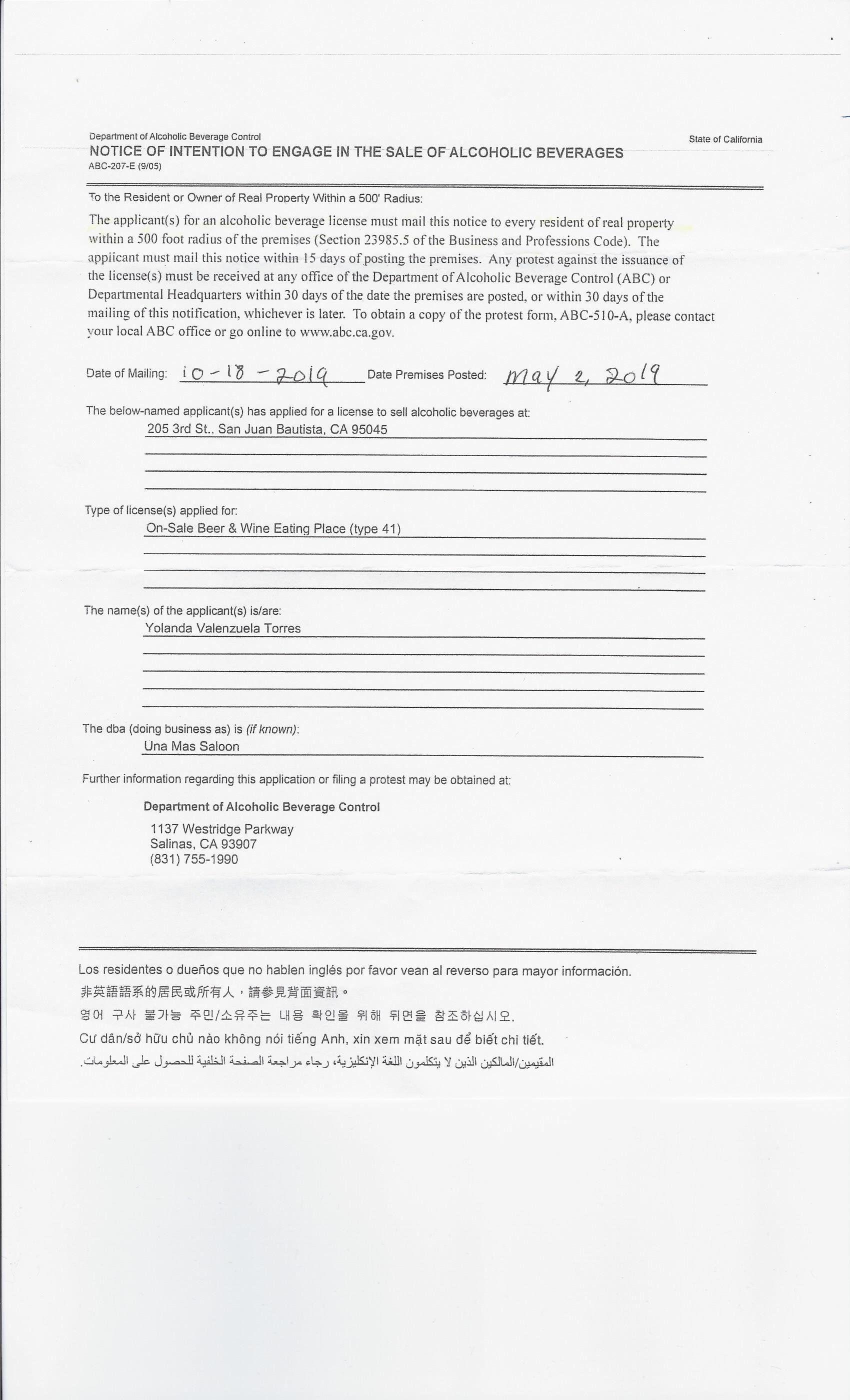 Notice of Intention to Engage in the Sale of Alcoholic Beverages