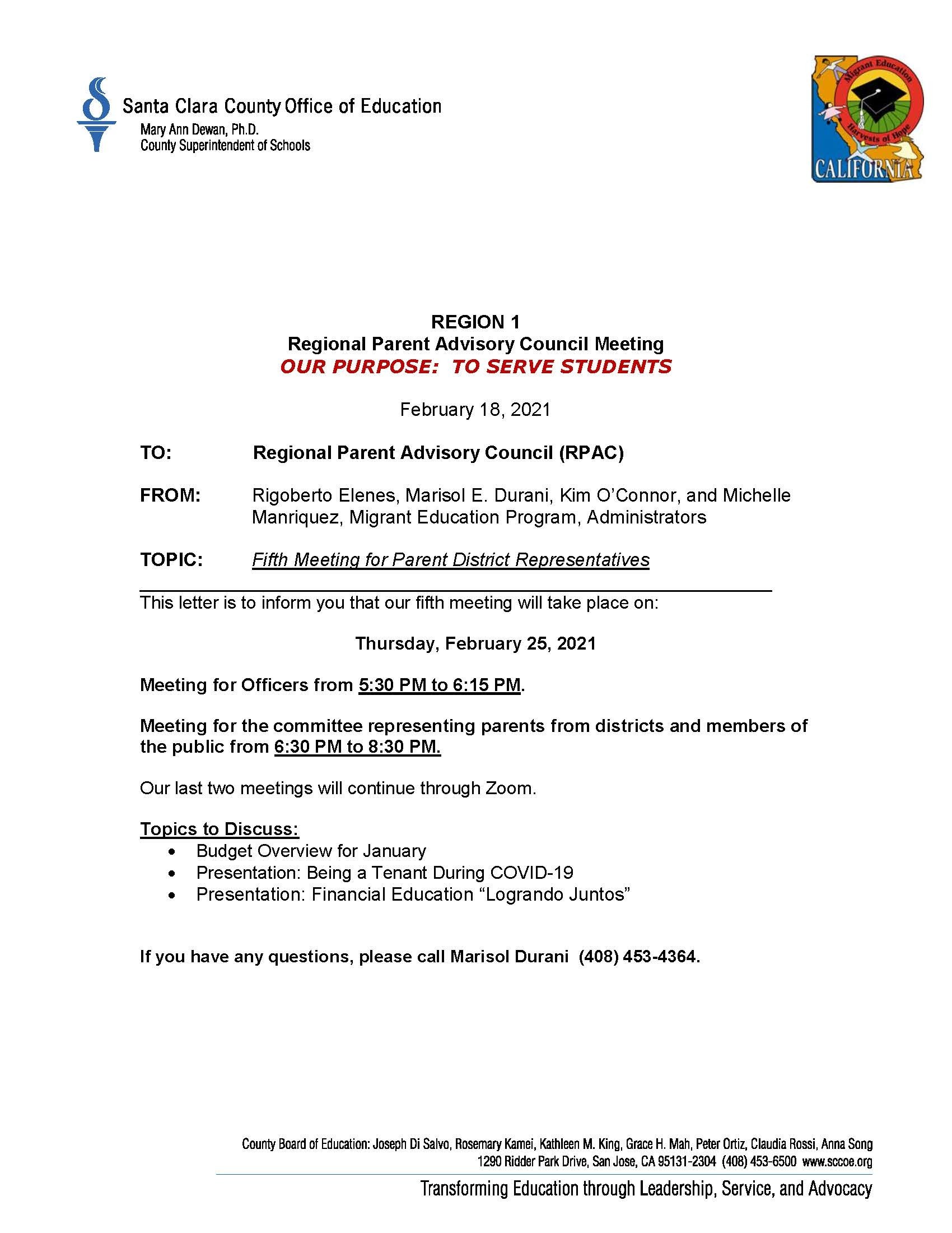 Regional Parent Advisory Council Meeting- February 25, 2021