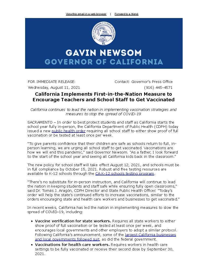 PRESS RELEASE: Vaccination Mandate